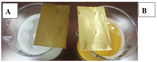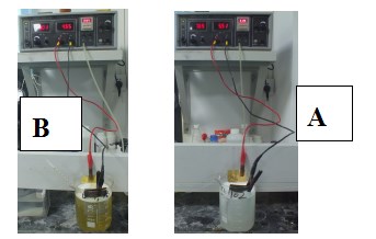 4:將涂抹混合油后赫爾片分別放入A、B杯子中,赫爾片接陽極、鈦板接陰極。