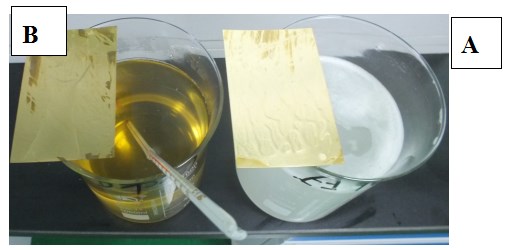 4:將涂抹混合油后赫爾片分別放入A、B杯子中。